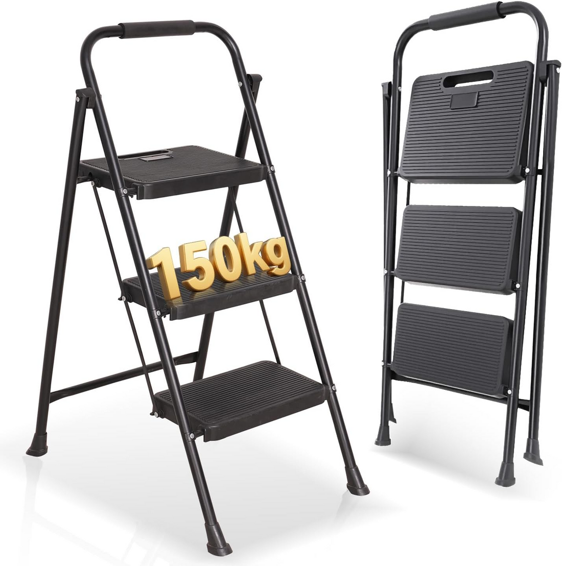 OUTIGO Step Ladder, Foldable Step Stool for Adults with Wide Anti-Slip Pedal, Lightweight 3-Step Ladder for Home Use, Foldable